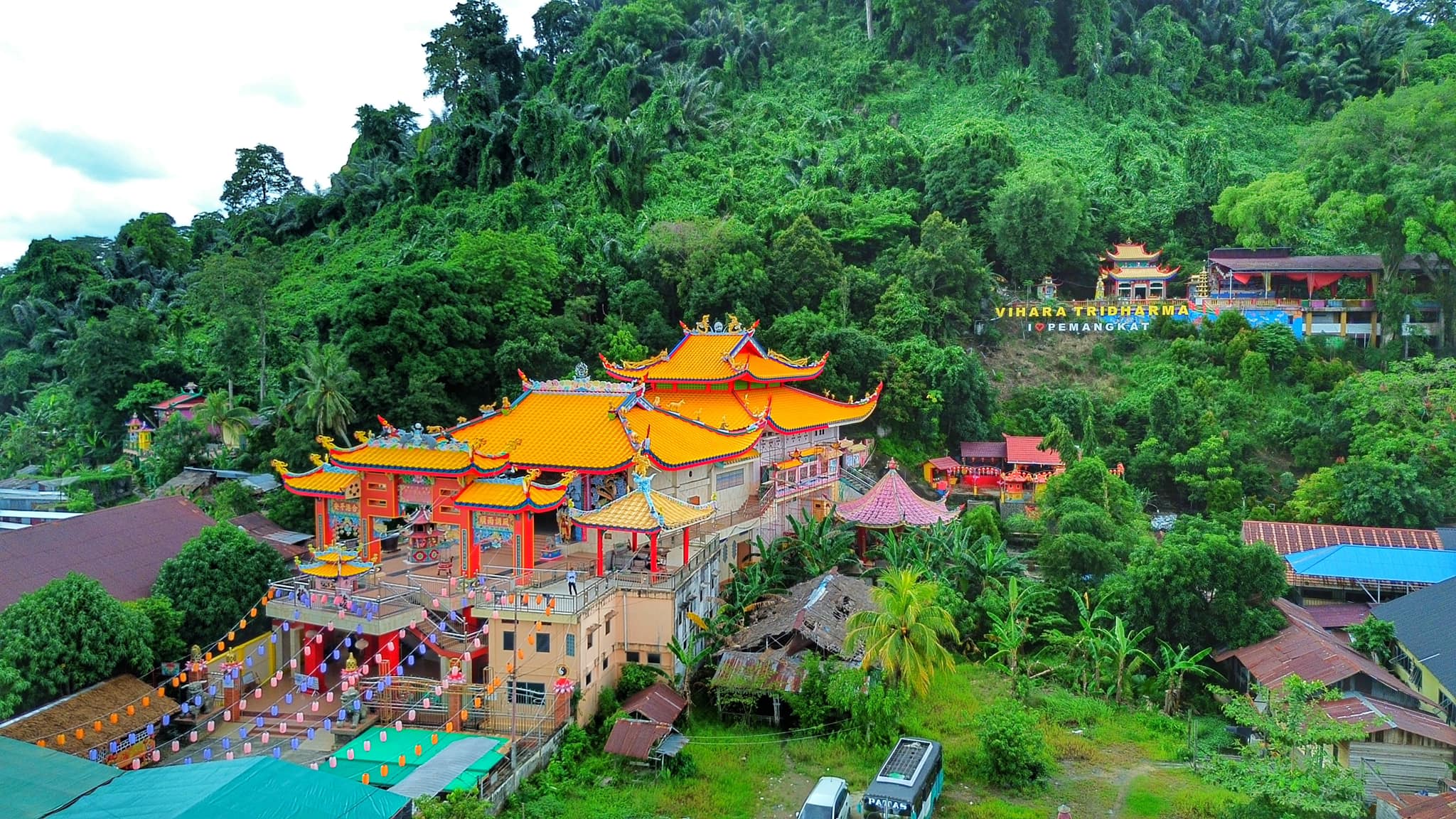 Vihara Tri Dharma Pemangkat, atau Vihara Tri Dharma Bumi Raya, adalah permata budaya yang berdiri megah sejak 1800-an di jantung Kota Pemangkat. Terletak di kaki Gunung Gajah dan menghadap langsung ke pusat kota, vihara berarsitektur Tionghoa ini memancarkan aura spiritual yang kuat sekaligus memikat. Ornamen Mandarin yang klasik, warna merah yang khas, serta suasana tenang menjadikannya tempat ideal untuk merasakan kedamaian sekaligus menikmati keindahan budaya Tionghoa.